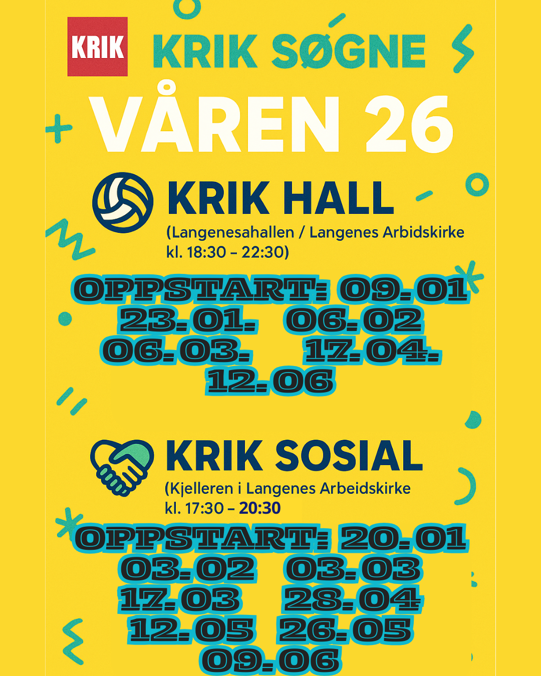 I år kjører vi KRIK HALL i Langeneshallen + Langenes Arbeidskirke annenhver lørdag, og KRIK SOSIAL annenhver tirsdag i kjelleren i Langenes Arbeidskirke. Begge deler i partallsuker. Velkommen!