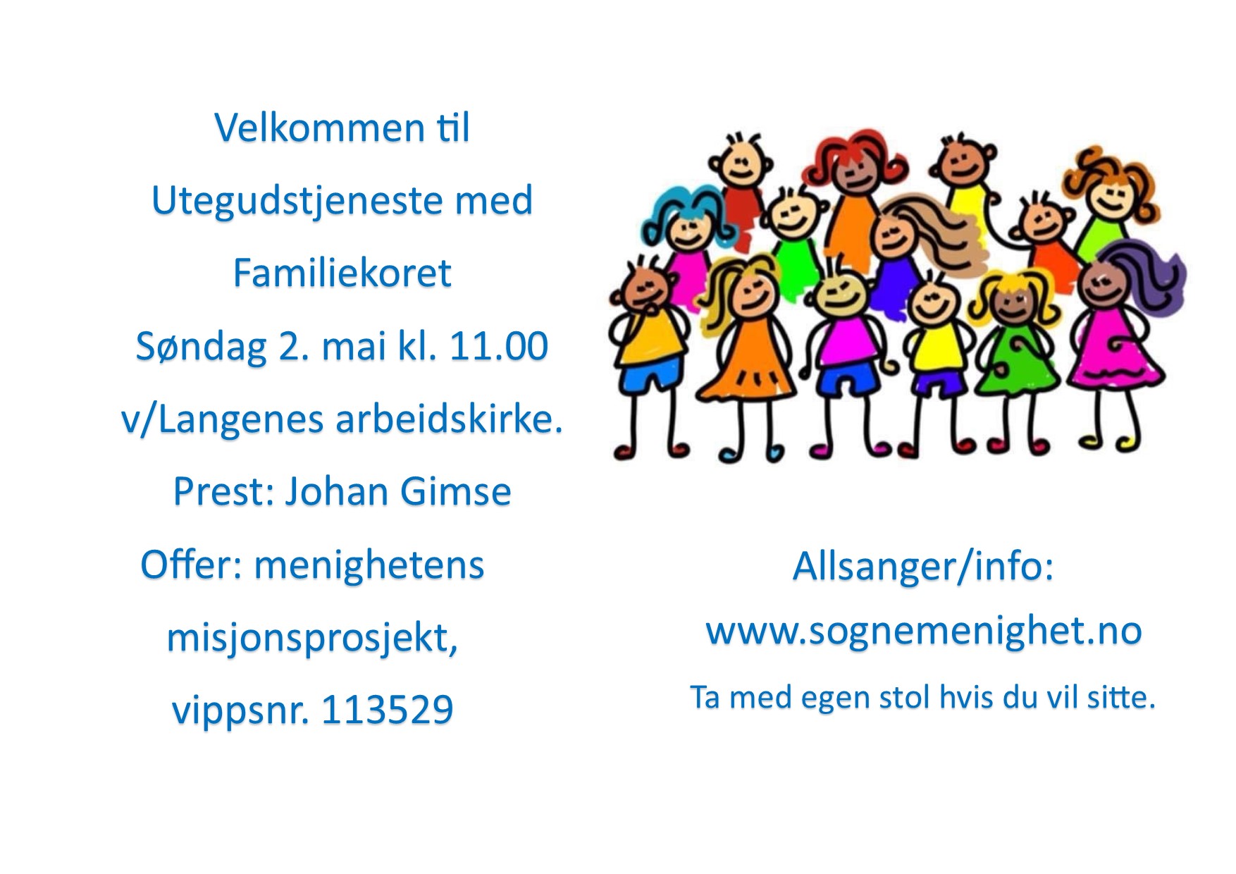 Til søndag møtes vi til utegudstjenste på parkeringsplassen utenfor Langenes arbeidskirke kl. 11.00. Familiekoret og prest Joahn Gimse kommer. Vi håper å seg deg også! Husk å møte opp i god tid for registrering. Vi har merket opp ringer hvor du kan stå. Det er to meter mellom ringene for at alle kan være med og synge. Ta med egen stol hvis du vil sitte. Etter gudstjenesten blir det kirke-is:-)