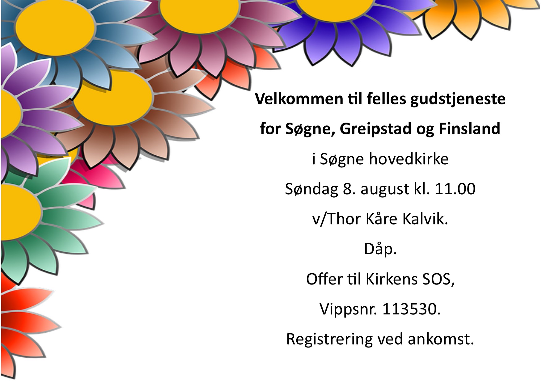 Velkommen til gudstjeneste i Søgne hovedkirke søndag 8. august kl. 11.00 v/Thor Kåre kalvik. Det blir dåp og takkoffer til Kirkens SOS, vippsnr. 113530.