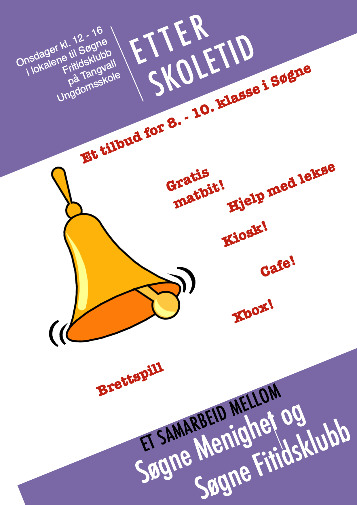Søgne Menighet og Søgne Fritidsklubb er stolte av å presentere "ETTER SKOLETID" Kom å bli med på onsdager :-)