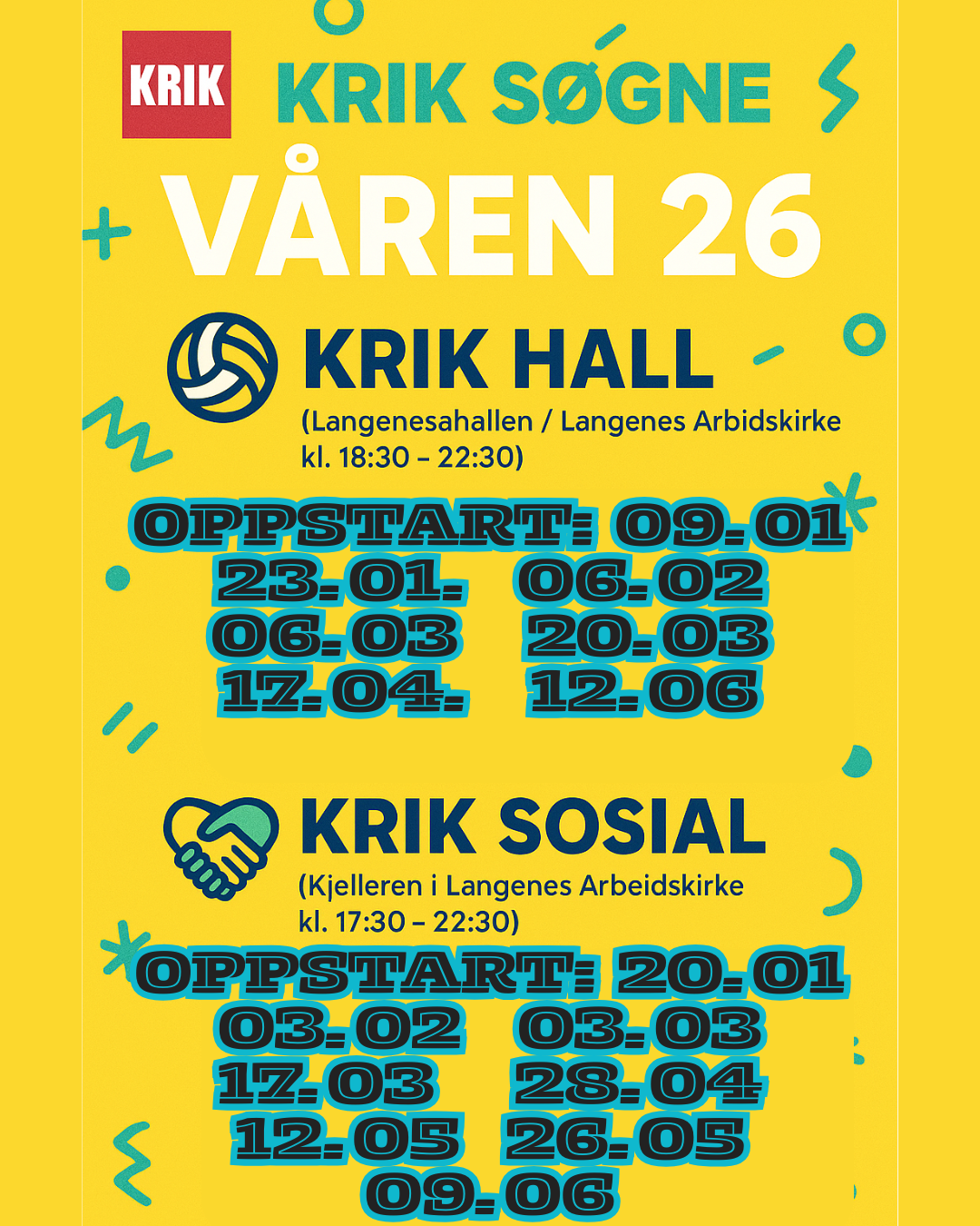 I år kjører vi KRIK HALL i Langeneshallen + Langenes Arbeidskirke annenhver lørdag, og KRIK SOSIAL annenhver tirsdag i kjelleren i Langenes Arbeidskirke. Begge deler i partallsuker. Velkommen!