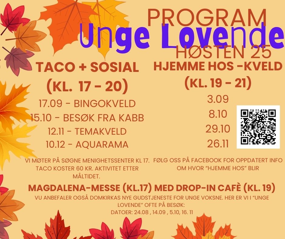 Programmet for Unge Lovende Høst 2025 er klart! Unge Lovende er for unge voksne mellom 20 og 40isj i Søgne- og omegn! Vi møtes to onsdagskvelder i måneden. Klikk deg videre for program.